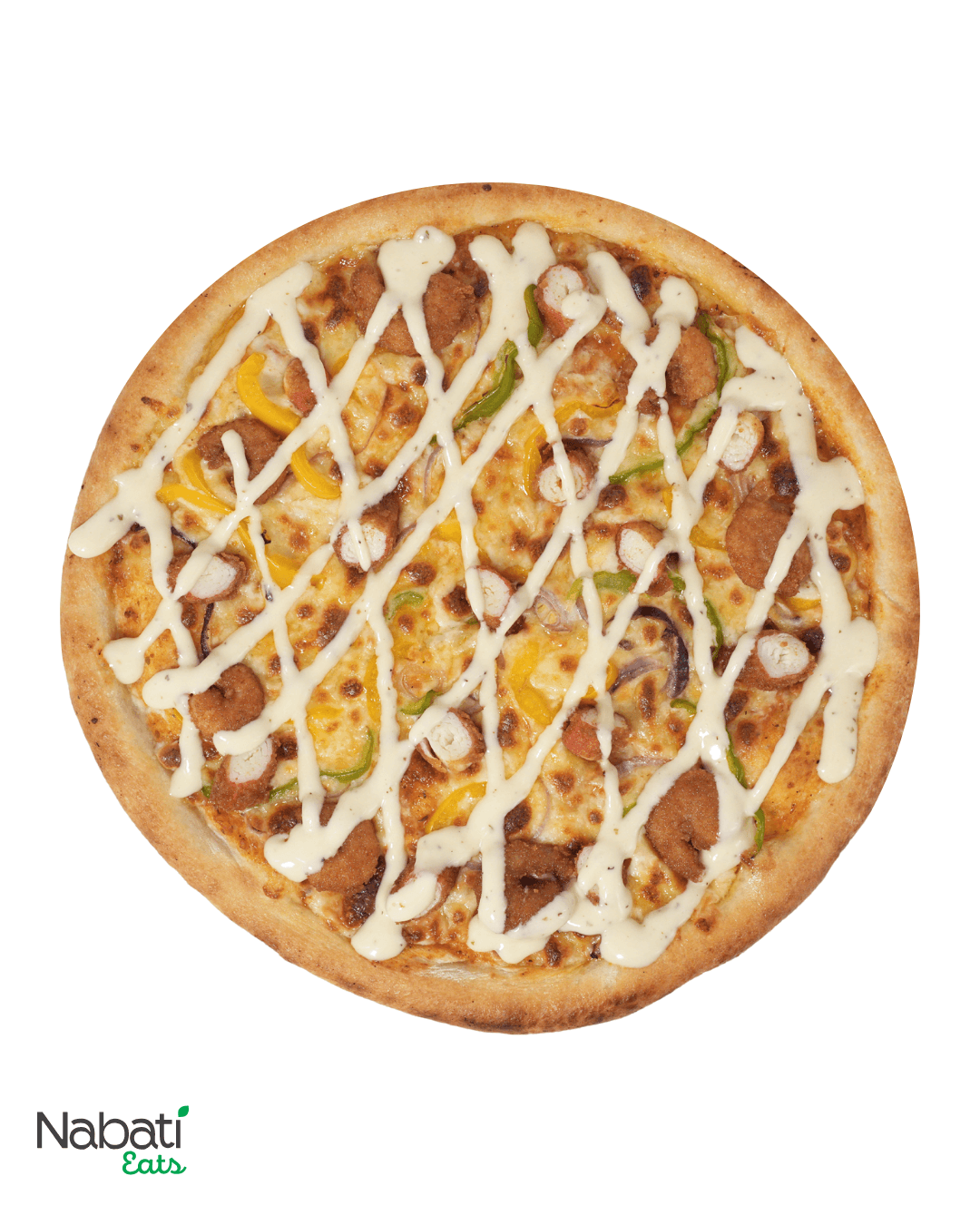Vegan alfredo sauce, vegan mozzarella cheese, fried Shrimp, fried crab, bell peppers onions, dill and oregano topped with vegan ranch sauce.