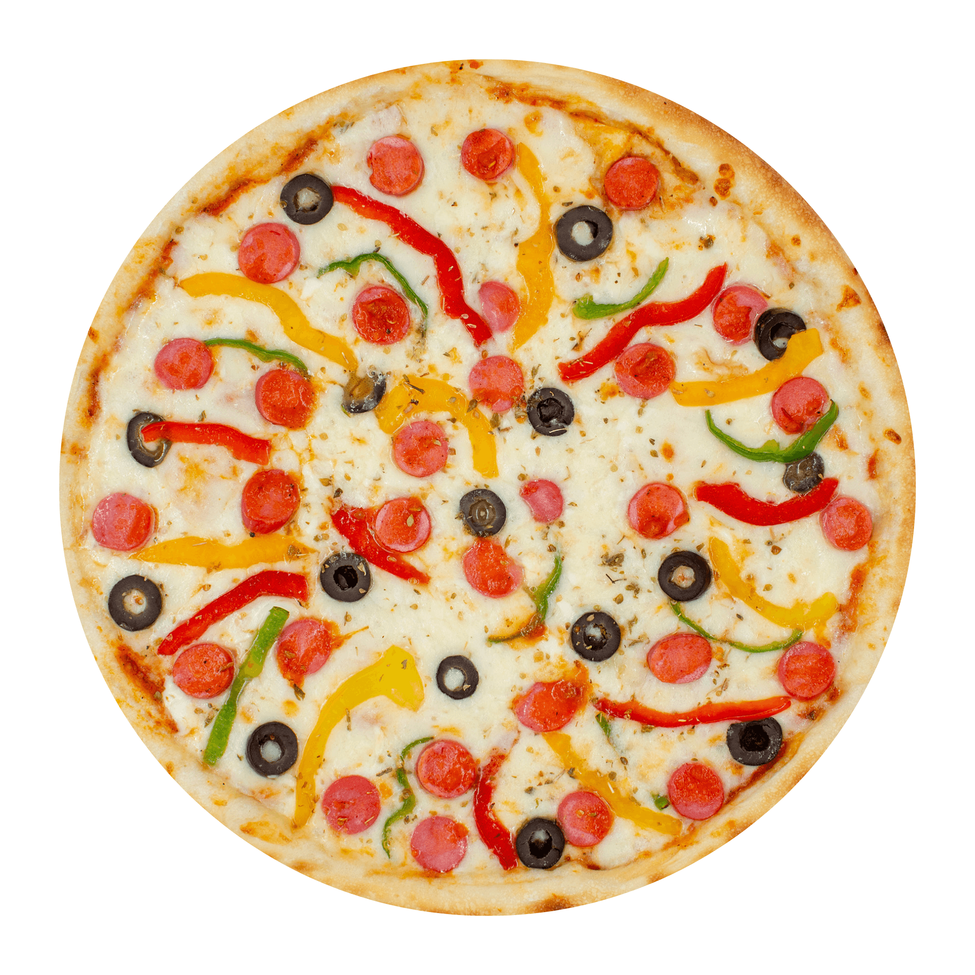 Pizza sauce, vegan mozzarella cheese, vegan hot dog, bell peppers, olives, onions and oregano.